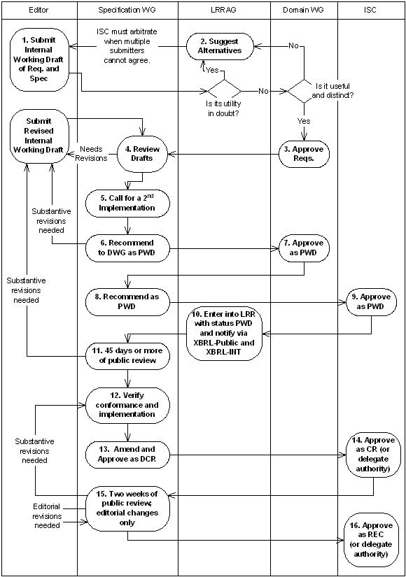 XBRL provides a set of standard roles and arc roles (hereinafter generally referred to as “roles”) that may appear in XBRL instances and linkbases. As XBRL applications emerge, it is leading to the proposal of new, non-standard roles having common and useful semantics. The goal of the XBRL Link Role Registry (hereinafter “LRR”) is to be a public, online data set that documents these non-standard roles and their usage. Additions and other changes to the LRR, like other XBRL International work products, will proceed through a series of steps whose goal is to maximise the utility and longevity of the new roles and the taxonomies that use them.