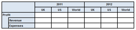 This example extends the simple example in Section 6.1. Figure 27 shows a table in which the y-axis is defined as in the previous example (see Figure 26), but the x-axis breaks down the data by every combination of the Period and Geography dimension. This can be thought of as two separate breakdowns, combined by taking their cross-product.