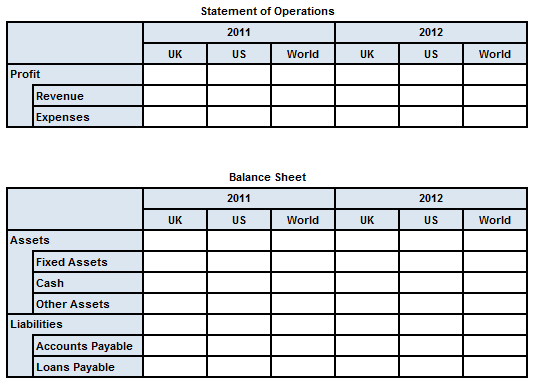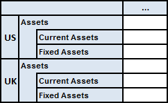 Figure 24 gives an example of a simple table in which concepts are displayed in a tree on the y-axis (rows) and the x-axis (columns) breaks down the reported facts by dimension. In this case, facts are initially broken down by the Product dimension; data for Widget A is further broken down by the Geography dimension (perhaps because only Widget A is sold in multiple regions), with a roll-up column to display the total for all regions.