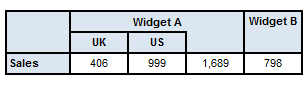 To illustrate this further, consider the following alternative example, where only Widget A has been broken down by Geography (since there are no facts reported against the Geography dimension for Widget B), and ES has been omitted from the drill-down despite having facts reported against it: