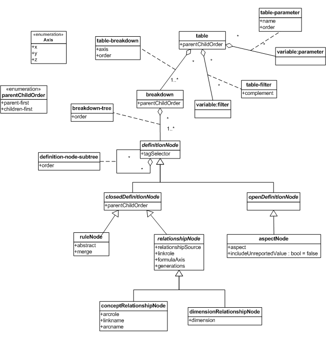 Fixed link in aspect value equality for typed dimensions to point to the correct section of the variables specification. This avoids implying that custom typed-dimension aspect tests are not applicable within this specification. Remove outdated wording in the variable references section - nodes can no longer define variables. Also delete requirement to raise an error for cyclic dependencies between variables. Since Table Linkbase can no longer define variables, cycles can only occur between global parameters, and this is validated by the Variables specification upon which this specification depends. Remove wording about how relationships linking labels and references to Table Linkbase constructs may be in any extended link role. This is already made clear by the XLink specification and does not need re-stating here. Added missing description of the XPointer mechanism used to reference facts from cells in the layout model serialisation. Added missing definition and equality for OCC (non-XDT segment/scenario) aspect values. Added missing error code for unrecognised aspect rules. Make explicit which filters are associated with a given cell in a table. Added error code for when the result of an XPath expression on a relationship node cannot be cast to the required type. Generalise error code for merged rule nodes with labels to cover other types of definition node which must not have labels. Removed the ability to specify the participating dimension of a dimension relationship node using an XPath expression. By referencing parameters, this capability could have violated the requirement for the participating aspects of a breakdown to be determinable during resolution in the absence of an instance. The ability to define aspects of a breakdown dynamically may be revisited in a future version of this specification. |