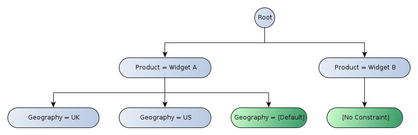 As shown in Figure 25, the x-axis is defined in terms of rules that explicitly select values for each dimension. Each rule node defines a single node in the structural model (with the exception of the root definition, which exists only as a container). An implicit roll-up node is required as a child of the node 'Product = Widget B', to balance the tree and reserve a column in the rendered table.