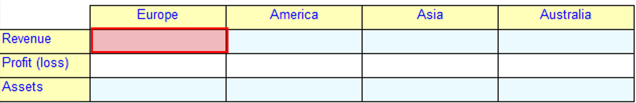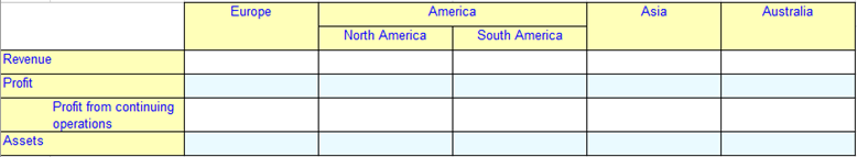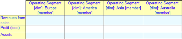 Reporting templates often have a complex layout involving nested columns and indented rows. A variation of the previous Segment Reporting example is shown in Figure 3. As before, the continents are modelled as domain members and the disclosure items are defined as concepts.