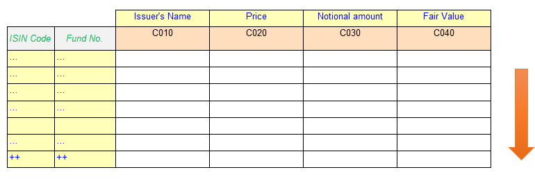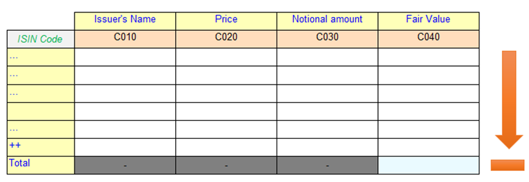 Let’s take the example of Figure 19 which is an extract of a portfolio disclosure. The investment products are identified by the combination of "ISIN code" and "Fund number". It has an intermittent total row for each investment type. "ISIN code" and "Fund number" (on the rows) are modelled as typed dimensions and the disclosure items (on the columns) are modelled as concepts. Each investment is additionally qualified as either "shares" or "bonds" and identified by an explicit dimension member.