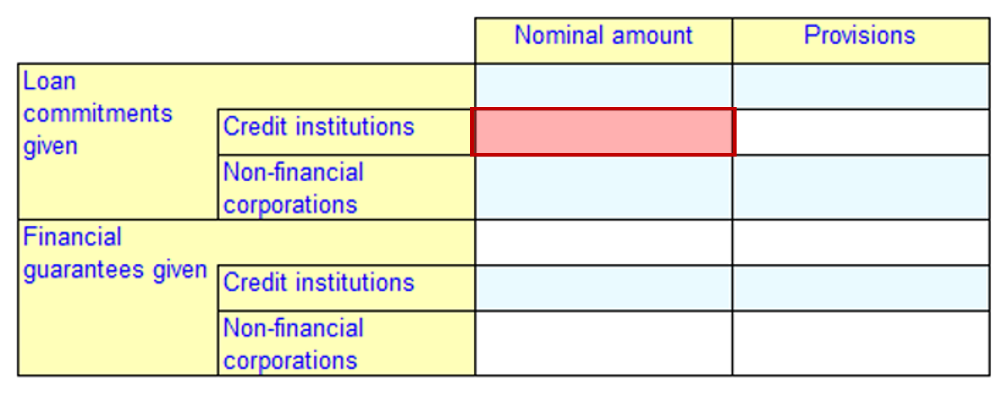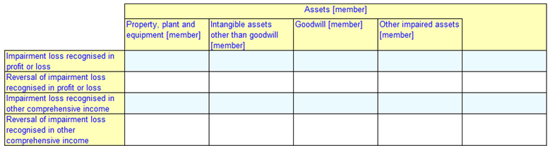 Here there is only one y-axis breakdown defined, with rule nodes specifying the concept. Since an x-axis breakdown is not present, the cells in Figure 20 do not inherit any aspect other than the concept. While using XBRL reporting template for XBRL report creation, software applications will enable preparers to provide other required aspects such as period.