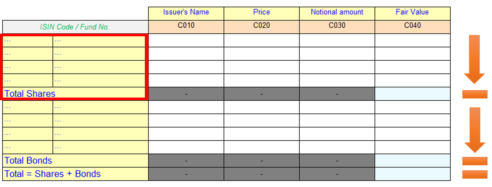 The highlighted block of cells in Figure 19 pertains to Shares, where users can add rows as required and report a total at the end. The following section explains the table definition for the highlighted shares region of the table.