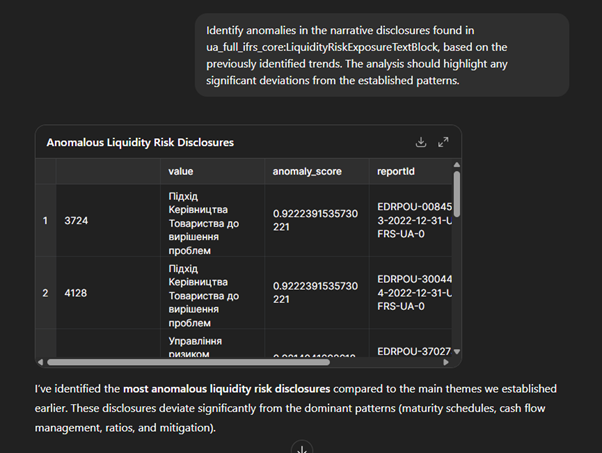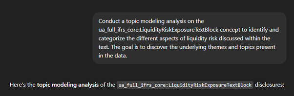 We observe clear disclosure patterns around liquidity risk—most companies frame it in terms of repayment schedules, reliance on banks, and strategies such as maintaining reserves or stress testing. What’s important here is how easily these themes emerged from a simple prompt, supported by ChatGPT’s ability to translate Ukrainian narratives into English. The structured tagging in XBRL meant I could target only the sections marked as ‘liquidity risk,’ avoiding noise and making the analysis both efficient and reliable. This demonstrates how LLMs, combined with structured data, can quickly provide a meaningful overview before deeper exploration.