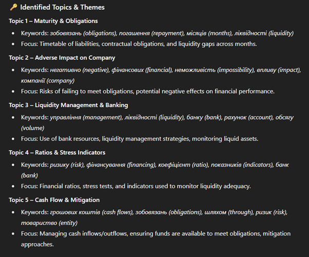 As an example, I asked ChatGPT to perform topic modelling on liquidity-related disclosures. The goal was to understand the different aspects companies focus on when discussing liquidity. This kind of targeted topic analysis helps break down a broad concept—like liquidity—into its component themes, such as cash flow management, credit facilities, debt maturity, and risk management practices.
