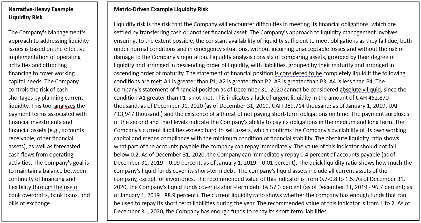 To illustrate, here’s a comparison between an anomalous liquidity disclosure and a standard disclosure. The contrast shows how anomalies often miss key specifics that are commonly included in typical reports.